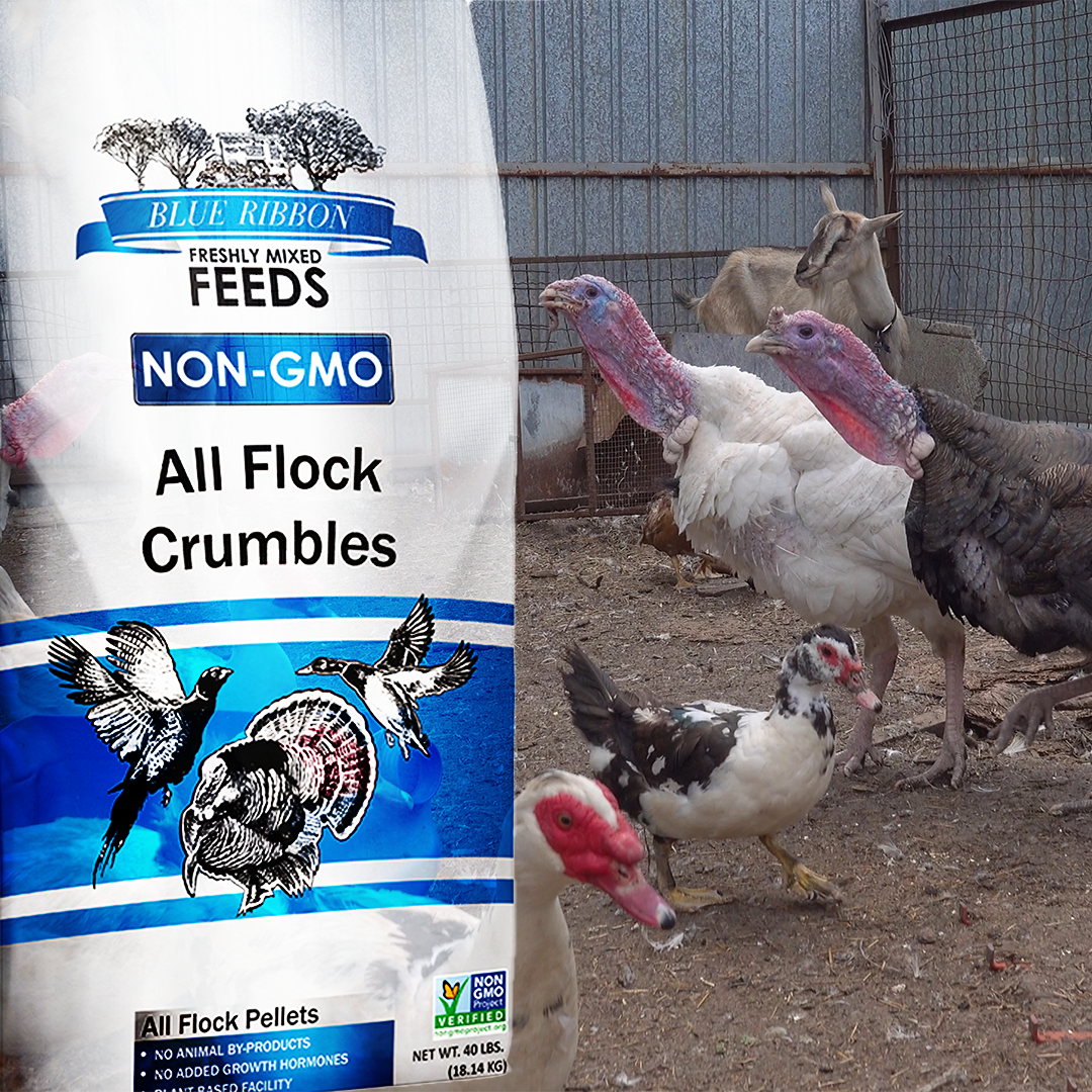 Blue Ribbon Non-GMO All Flock Crumbles is a complete feed for adult chickens not actively laying, roosters, and specialty birds such as turkeys, ducks, and quail. The crumbles contain added probiotics, enzymes, and phytase to support digestion, immunity, and nutrient absorption, all without animal by-products or added hormones.