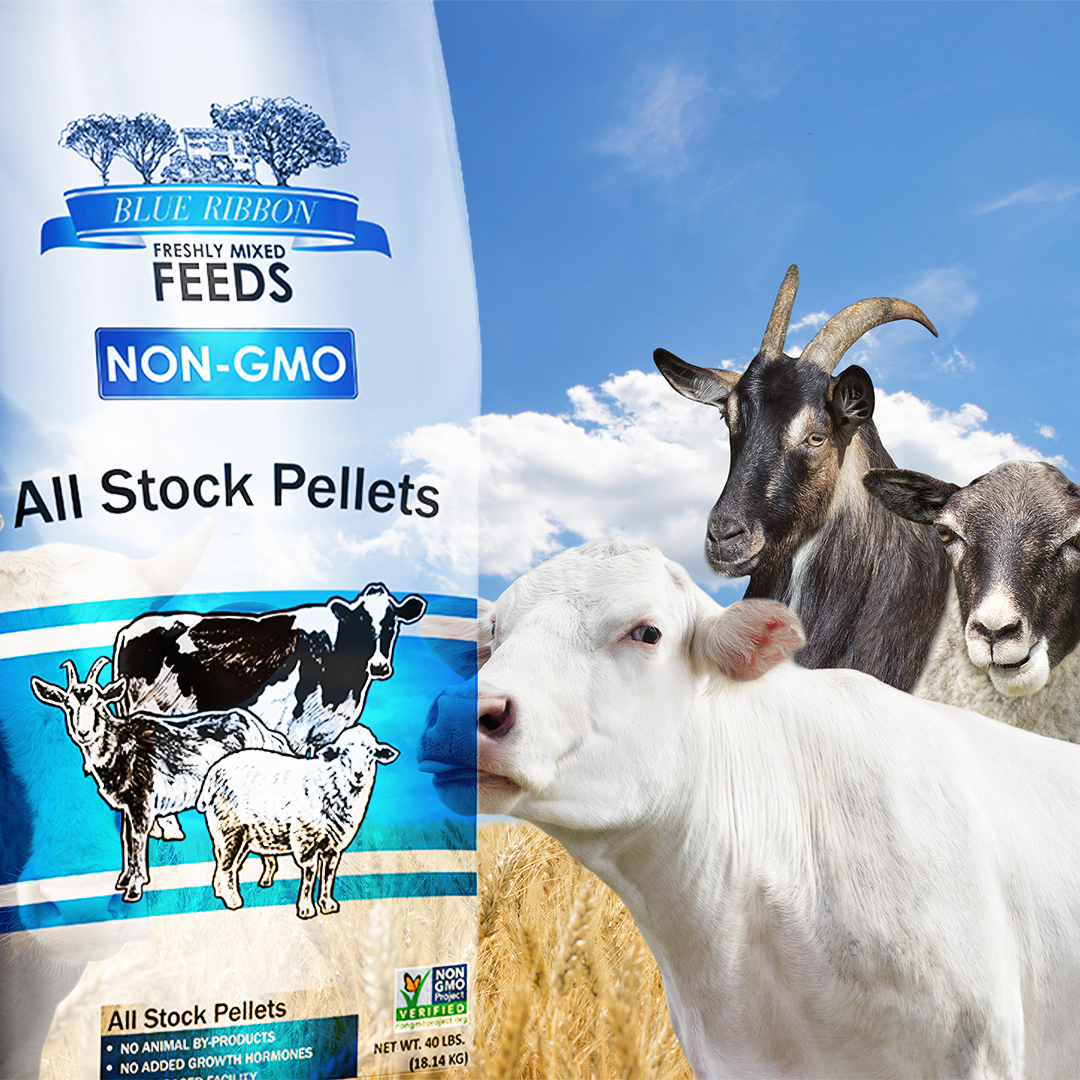 Blue Ribbon Non-GMO All Stock Pellets is a complete feed for adult cattle, sheep, and goats, made without copper for multi-species safety. Packed with plant proteins, vitamins, and antioxidants to support overall health, strong immunity, and fertility, these pellets contain no animal by-products or added hormones.