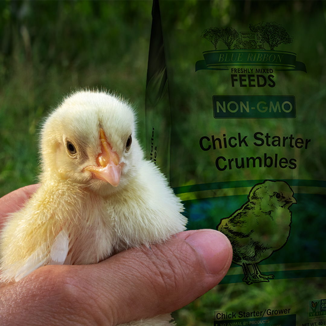 Blue Ribbon Non-GMO Chick Starter Crumbles is a complete feed made to help chicks grow strong and healthy with the right mix of vitamins, minerals, probiotics, and enzymes. With no animal by-products or growth hormones, these crumbles provide solid, clean nutrition from the start.